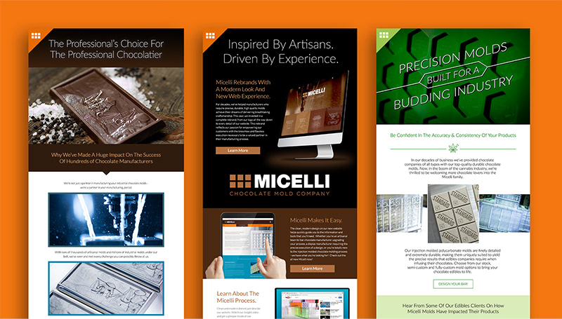 Brand Evolution & Long-Term Creative Leadership — Micelli Chocolate Molds has trusted me with their brand for more than 15 years, beginning with high-profile trade show experiences and evolving into full brand stewardship. With nearly 80 years of history and a legacy as pioneers of plastic molds, the challenge was to modernize the brand for the artisan chocolate market without losing its precision, craftsmanship, or credibility. I led a complete brand evolution—refreshing the identity system, messaging, and visual language, and extending it across iconography, video, animation, collateral, and a technology-forward website built for discovery and education. What followed was a sustained creative partnership, including year-over-year integrated marketing campaigns across Google, social, and email, and the launch of Micelli’s industry-loved For the Love of Making Chocolate editorial series, helping position the brand as both an innovator and a trusted authority.