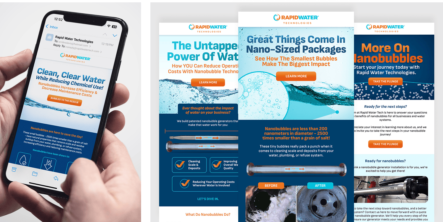 Rapid Water Technologies came to me with groundbreaking nanobubble generator technology and a need for clarity—both in brand and message—to reach key decision-makers across multiple industries. I repositioned the company as a leader in nanobubble innovation, developing a technology-forward brand identity supported by an innovative, high-performance website designed to communicate complex technology with clarity and confidence. Through high-impact animation, video storytelling, animated infographics, and tightly integrated email, social, and Google campaigns, I translated innovation into momentum. The result was a category-defining brand and digital ecosystem that attracted multimillion-dollar partnerships, licensing opportunities, and expansion into new industries driven by environmental innovation.